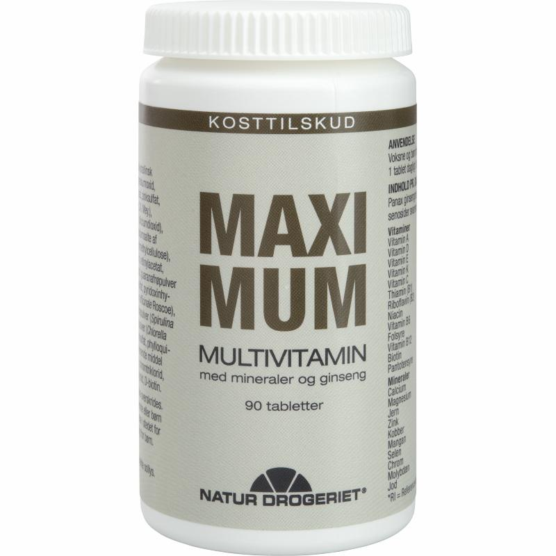 Maximum er et multivitamin/mineralpræparat som består af en bred sammensætning af vitaminer og mineraler samt ginseng. Maximum Multivitamin fra Natur Drogeriet er et kosttilskud, som har den egenskab at kombinerer 13 vitaminer, 10 mineraler og ginseng G1000 i én tablet, Sammensætningen giver et bredt dagligt tilskud af essentielle næringsstoffer, der kan være med til at understøtte kroppens normale funktioner.